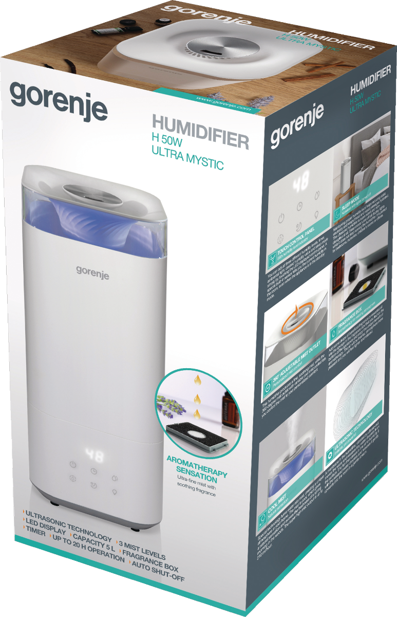 Antibakteriális szűrő, Hideg párásítás (nem befolyásolja a helyiség hőmérsékletét), Nagyon halk működés (megfelelő hálószobákhoz is) 38dBA, 3 különböző párartartalom szint beállítási lehetőség az érintőkijelzőn, 5 literes víztartály,