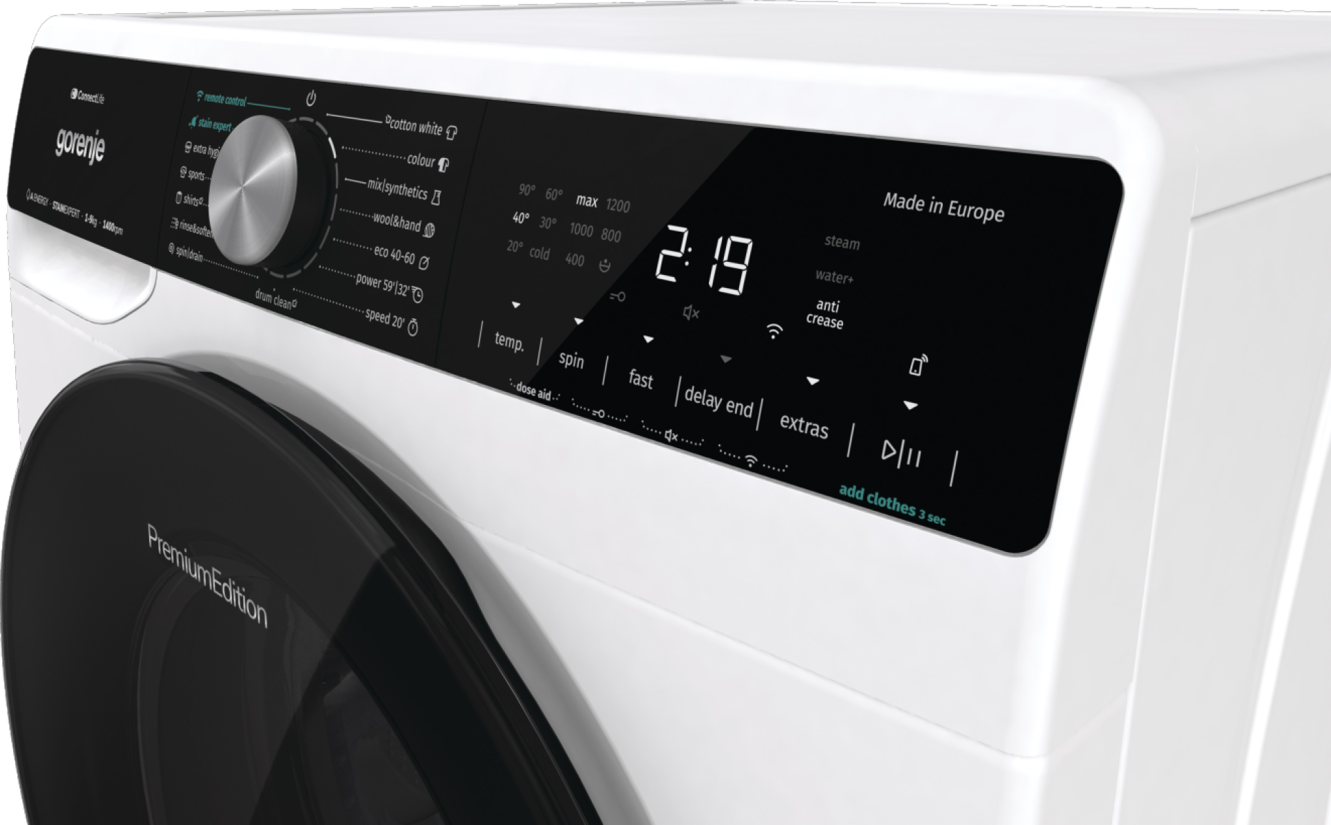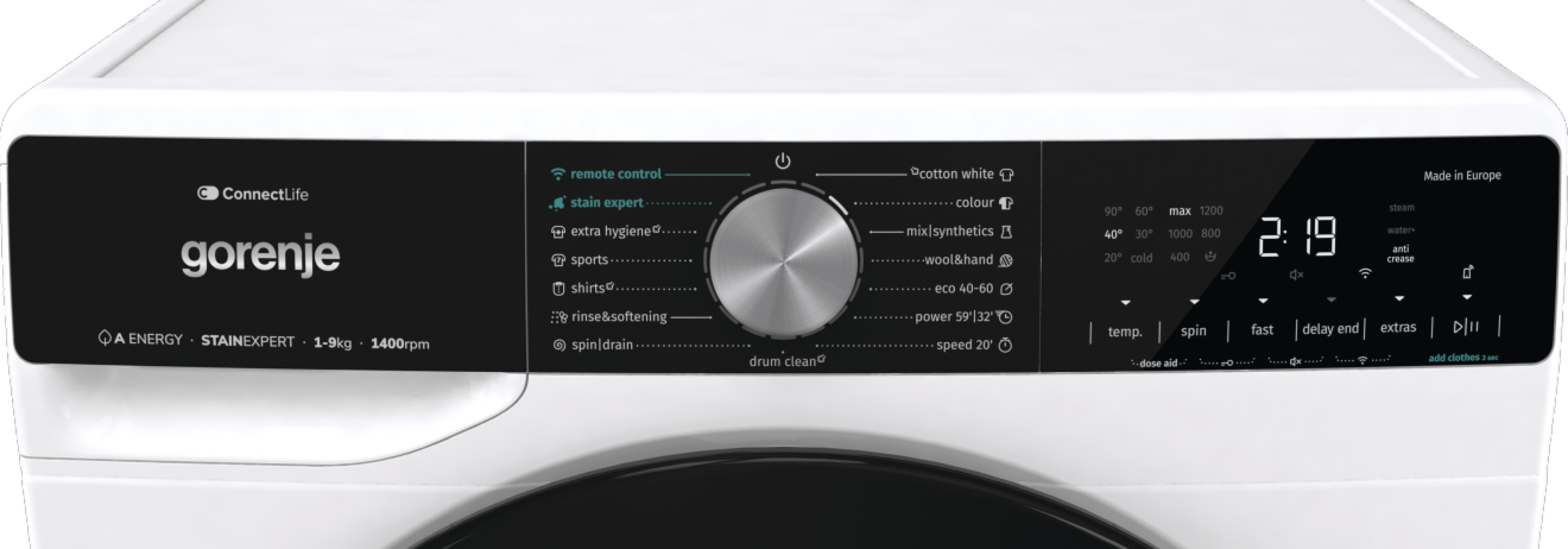 20perces gyorsprogram, PowerWash 59′ vagy 32′ perc, AntiCrease gyűrődésmentesítés, StainExpert – foltisztítás, ExtraHygiene, GŐZPROGRAMOK, SportWash, Baby..stb Hideg mosás,LED kijelző érintőgombokkal, AdaptTech memoria funkció, 24 órás késleltetés, Gyermekzár,