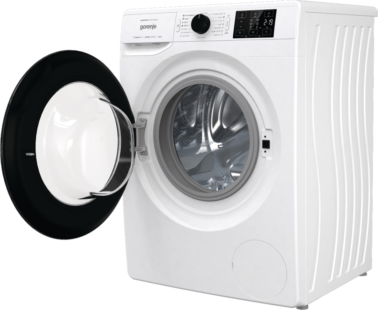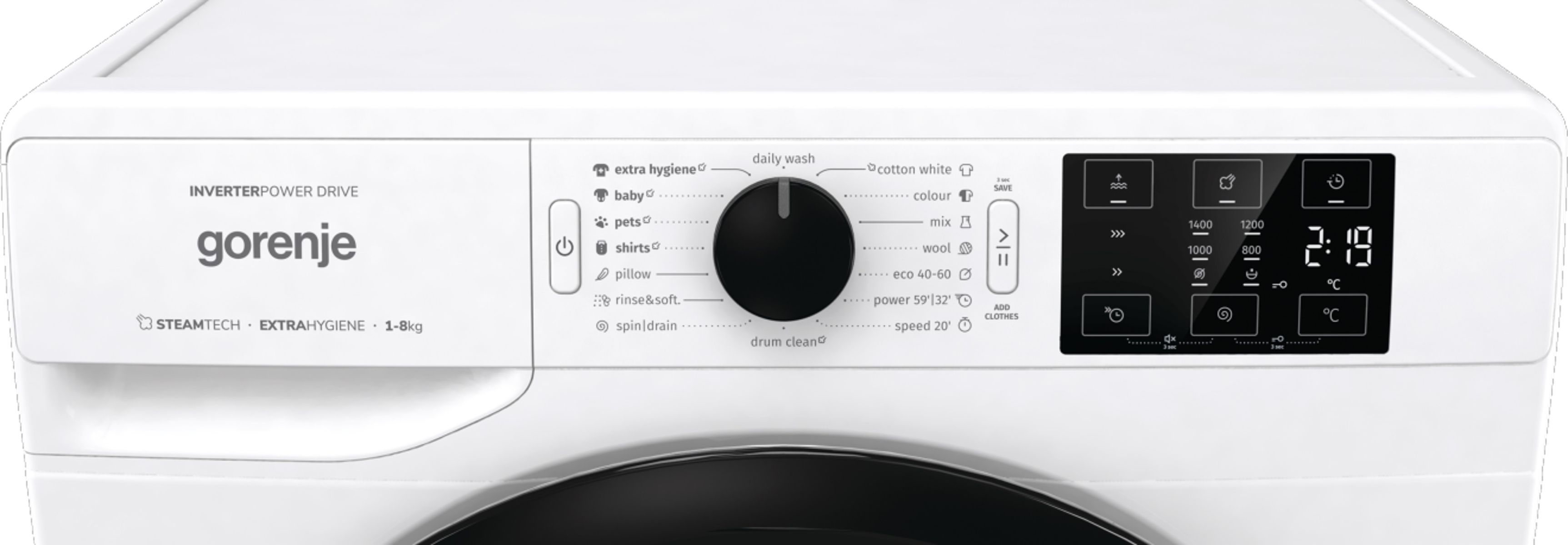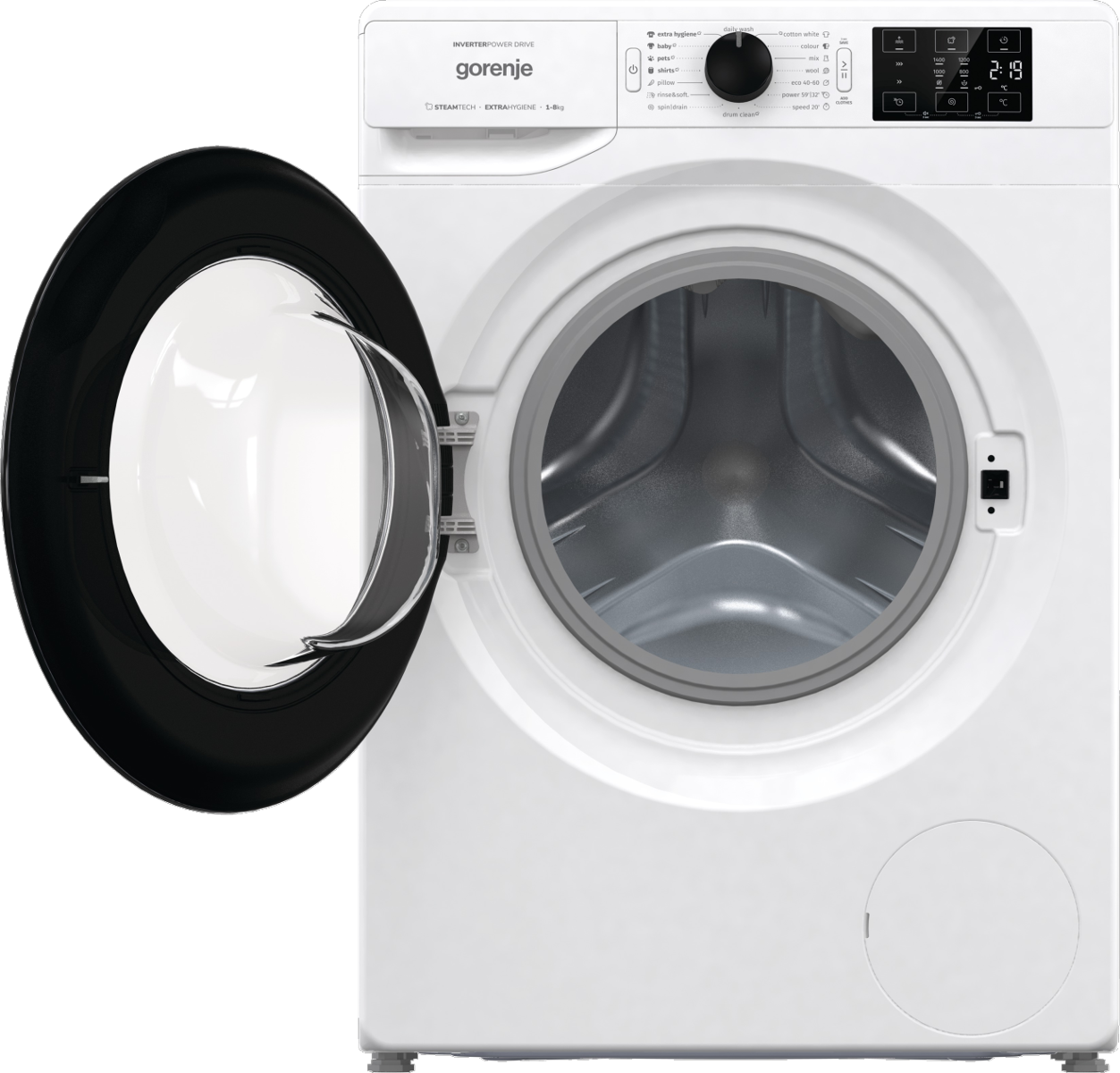 INVERTERES motor, 15 program – összes személyre szabható, GŐZPROGRAMOK, 20percses gyorsprogram, Gyűrődésgátló funkció, Normál/ECO/Időtakarékos mosási módok, ExtraHygiene. Baby program..stb.., LED kijelző süllyesztett gombokkal,